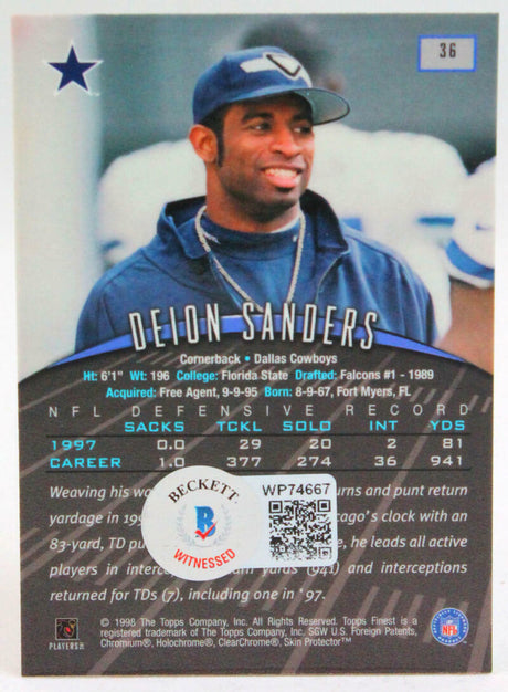 1998 Topps Finest #36 Deion Sanders Cowboys Autograph Beckett Witness