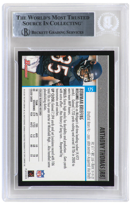 Very low stock (1 unit)$489Unit price /Unavailable Anthony Thomas Signed Chicago Bears 2001 Bowman Rookie Football Card #175 - (Beckett Encapsulated)