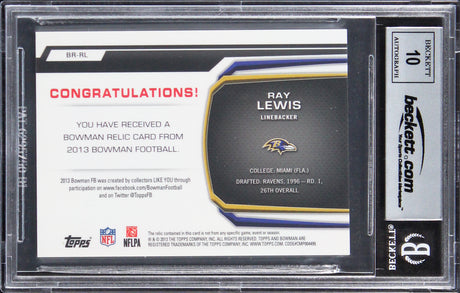 Ravens Ray Lewis Signed 2013 Bowman Relics #BRRL Card Auto 10! BAS Slabbed