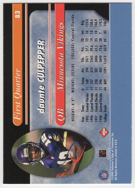 $59Unit price /UnavailableDaunte Culpepper Signed Vikings 1999 Collector's Edge Odyssey Rookie Football Card #83