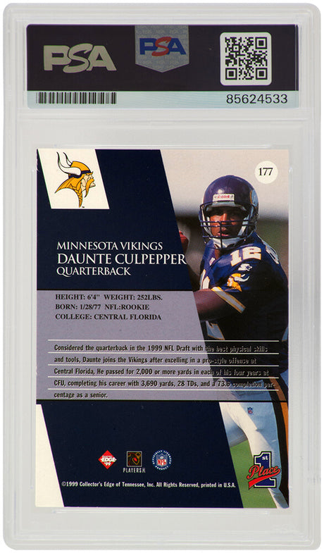 Low stock (4 units)$89Unit price /UnavailableDaunte Culpepper Signed Vikings 1999 Edge Rookie Football Trading Card #177 - (PSA Encapsulated)