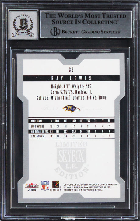 Ravens Ray Lewis Signed 2004 SkyBox LE #39 Card Auto Graded GM 10! BAS Slabbed