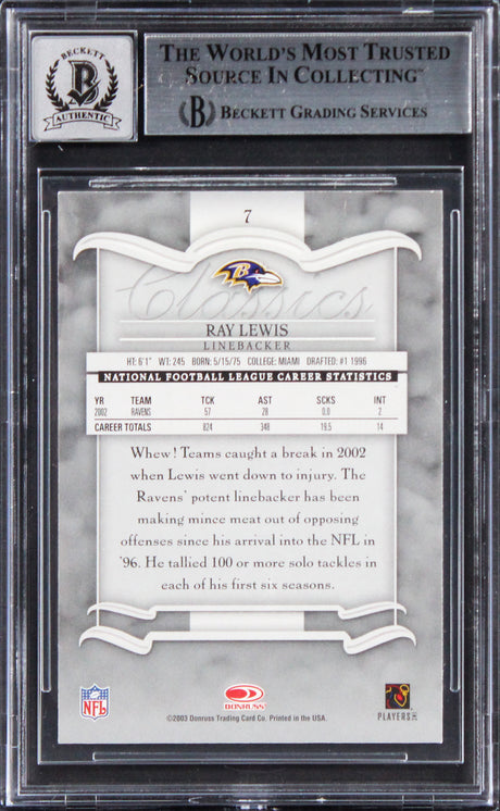 Ravens Ray Lewis Signed 2003 Donruss Classics #7 Card Auto Grade 10! BAS Slabbed
