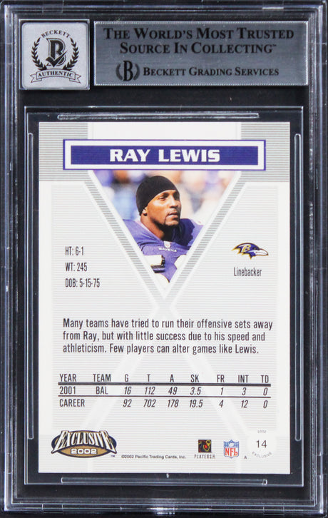 Ravens Ray Lewis Signed 2002 Pacific Exclusive #14 Card Auto GM 10! BAS Slabbed