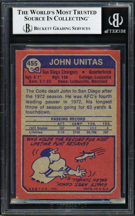 Johnny Unitas Autographed 1973 Topps Card #455 San Diego Chargers Beckett BAS #18283585