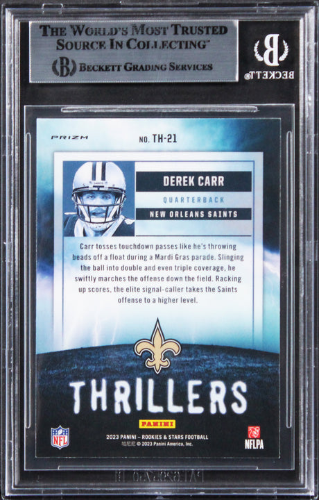 Very low stock (1 unit)$189Unit price /Unavailable Saints Derek Carr Signed 2023 Rookies & Stars Thrillers Silver #21 Card BAS Slab