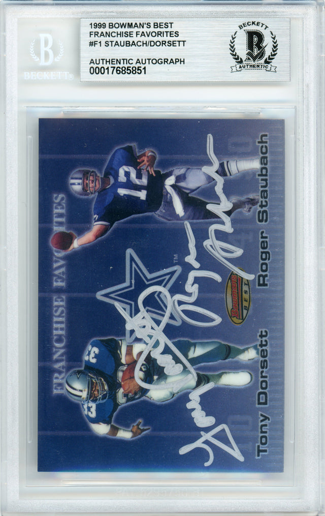 Celebrate Dallas Cowboys history with this iconic 1999 Bowman's Best Franchise Favorites #F1 Roger Staubach & Tony Dorsett dual autograph trading card. This rare collectible features the authentic hand signatures of two all-time Cowboys legends—Hall of Fame quarterback Roger Staubach and Hall of Fame running back Tony Dorsett. Professionally authenticated and graded by Beckett Grading Services (BGS), this card is a must-have for devoted NFL memorabilia collectors and lifelong Cowboys fans alike.