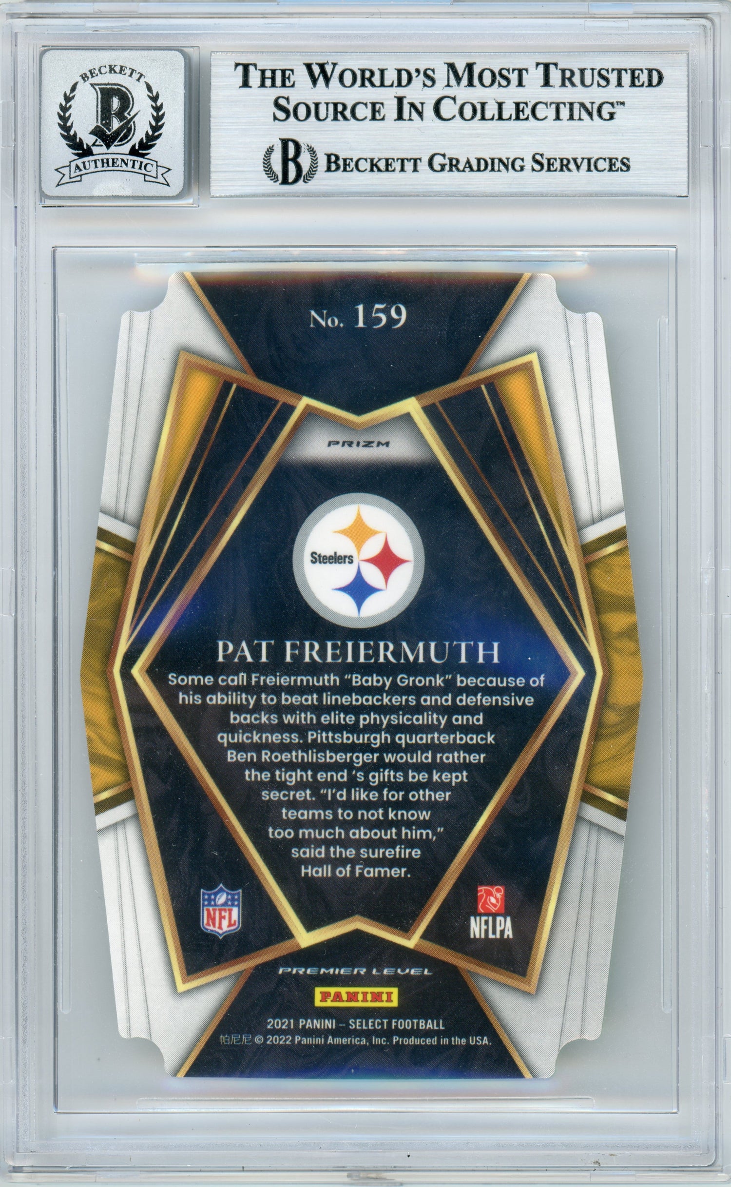 Own a piece of NFL draft history with this 2021 Select Prizm Green & Yellow Die Cut #59 Pat Freiermuth RC Autograph trading card. This striking rookie card features an authentic hand-signed autograph by Pat Freiermuth, standout tight end for the Pittsburgh Steelers, and is officially graded by Beckett Grading Services (BGS) for enhanced authenticity and collector confidence. A must-have for diehard Steelers fans and football card collectors, this unique parallel variation combines sharp design with long-term value.