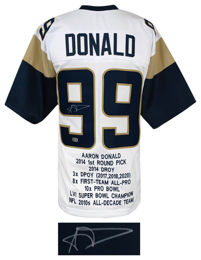 - Custom white jersey with detailed embroidered career stats to honor Aaron Donald’s legendary NFL career