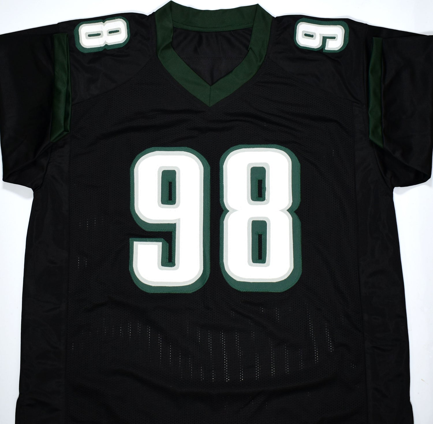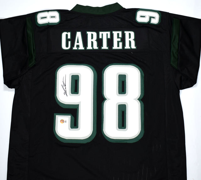 This is a Jalen Carter autographed custom jersey, celebrating one of the Philadelphia Eagles' rising stars. Please note: THIS IS NOT AN OFFICIAL NFL JERSEY. This custom-made (non name brand) jersey features stitched letters and numbers but contains no official tags, logos, or emblems. This incredible piece of Philadelphia Eagles memorabilia is ideal for fans and collectors who value authentic, hand-signed items.