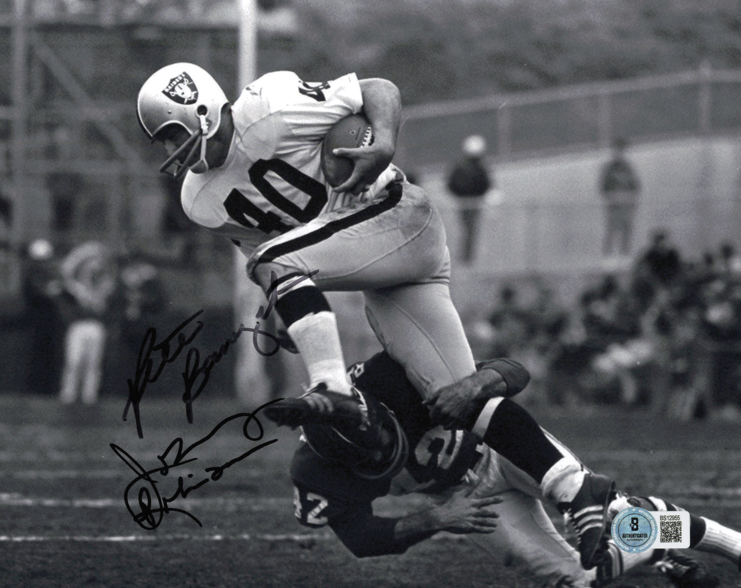 This collectible 8x10 photo has been personally hand signed by two legendary football icons: Pete Banaszak, standout fullback for the Oakland Raiders, and Johnny Robinson, Hall of Fame safety for the Kansas City Chiefs. This dual-signed item is a rare piece of memorabilia that celebrates the rich history of the American Football League (AFL) and two of its marquee players whose careers helped shape pro football in the 1960s and 1970s.