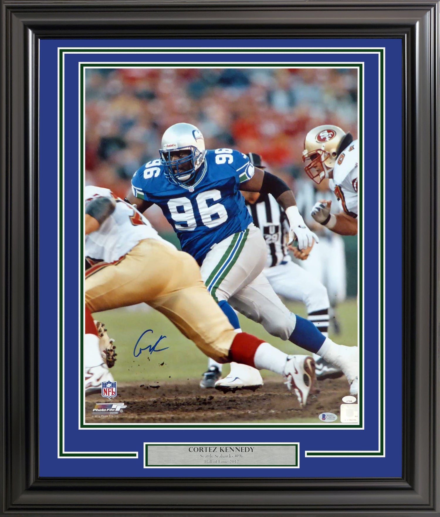 Own a piece of NFL history with this framed 16x20 photo autographed by Hall of Famer Cortez Kennedy. Measuring approximately 24x28 inches with the frame, this signed collectible is a must-have for Seattle Seahawks fans and memorabilia enthusiasts.