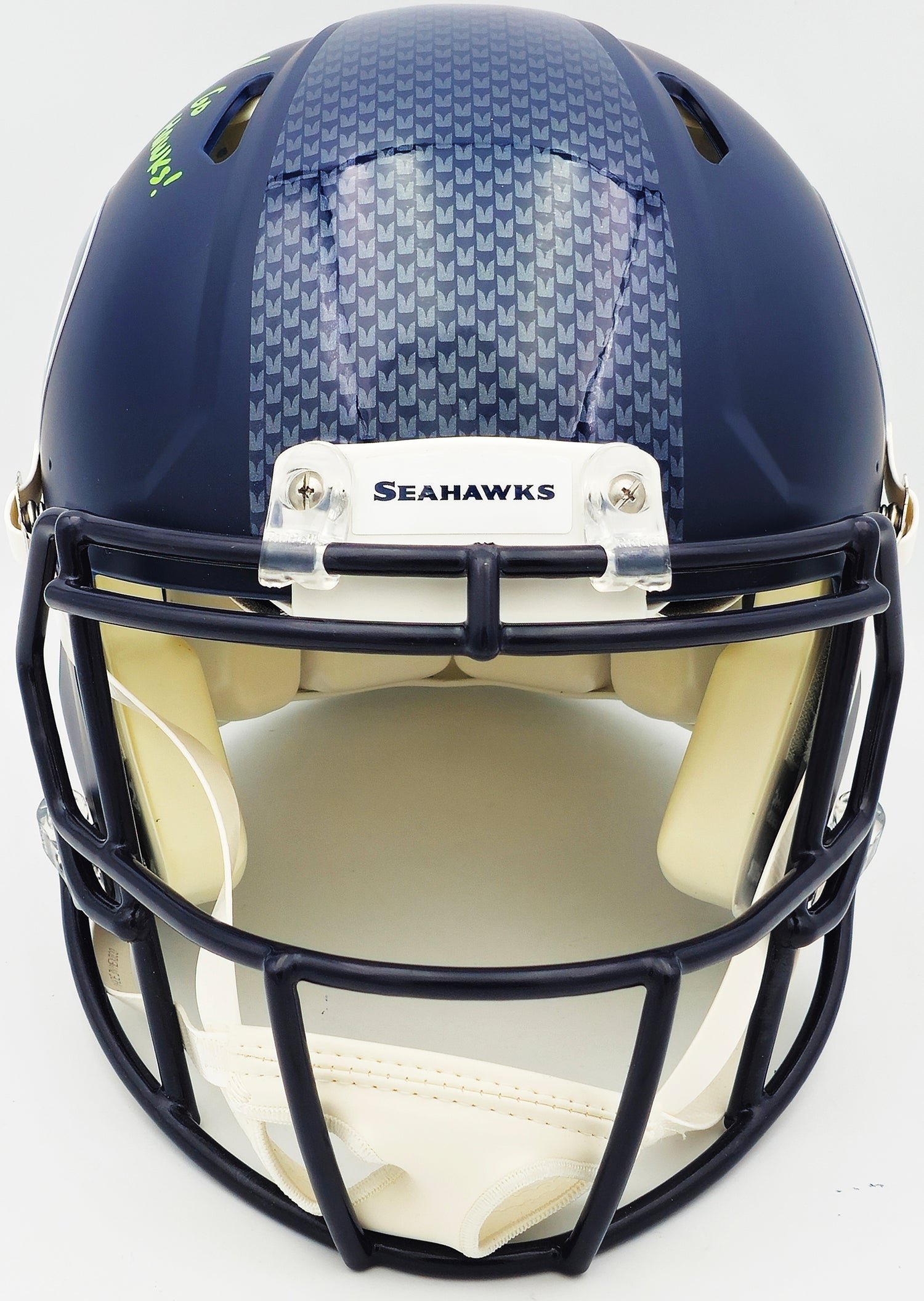 This Seattle Seahawks Blue Full-Size Speed Authentic Helmet is a must-have for dedicated fans and collectors. It has been hand-signed by star wide receiver Tyler Lockett and inscribed with "Go Hawks", making it a standout addition to any Seahawks memorabilia collection. This signed helmet is a perfect way to celebrate Lockett’s contributions to Seattle’s high-powered offense.