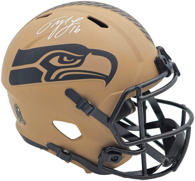 Tyler Lockett Autographed Seattle Seahawks Camo Brown 2023 Salute to Service Full Size Speed Replica Helmet MCS Holo Stock #236384