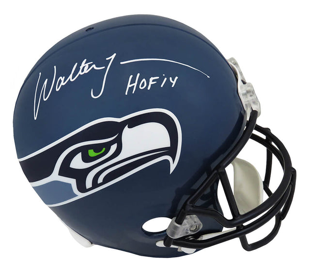 Celebrate the legacy of a Seattle Seahawks legend with this Walter Jones signed Seattle Seahawks Riddell full size replica helmet, complete with a bold "HOF 14" inscription. As a cornerstone of Seattle's offensive line and a Pro Football Hall of Fame inductee in 2014, Walter Jones is widely regarded as one of the greatest offensive tackles in NFL history. This signed helmet is a must-have for any dedicated fan or memorabilia collector looking to honor a true gridiron great.