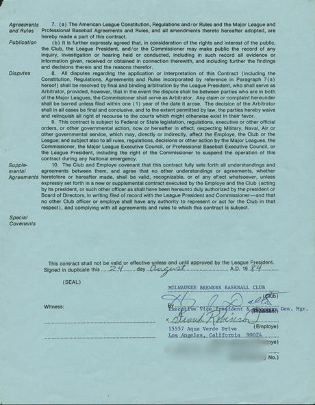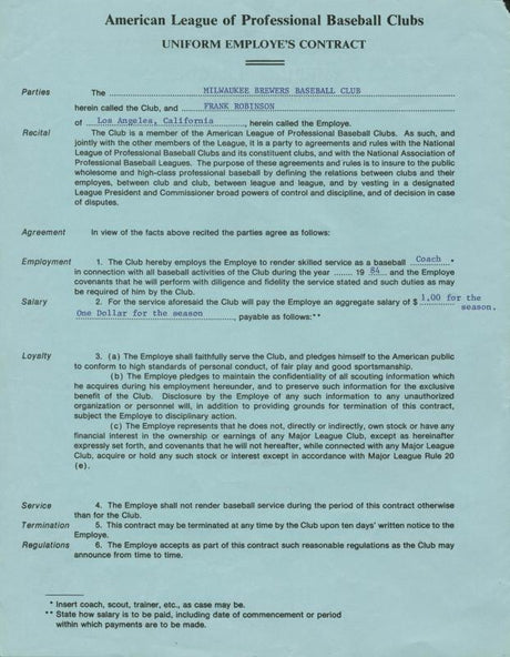 Frank Robinson Authentic Signed 1984 Brewers Coaching Contract PSA/DNA #X45024