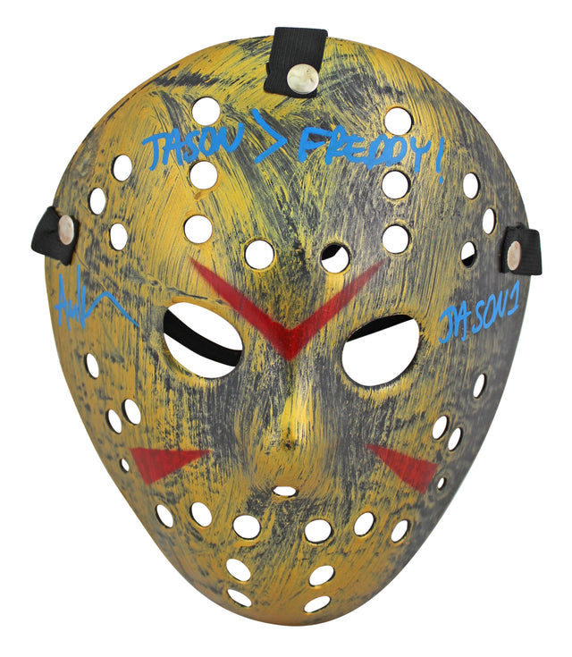 Own a piece of horror history with this Autographed Gold Jason Mask, personally signed by Ari Lehman, the original Jason from Friday the 13th. This striking collectible features a bold blue signature and the chilling inscription: "Jason > Freddy Jason 1." Perfect for horror enthusiasts and memorabilia collectors, this rare item captures the legacy of one of the most iconic slasher villains.
