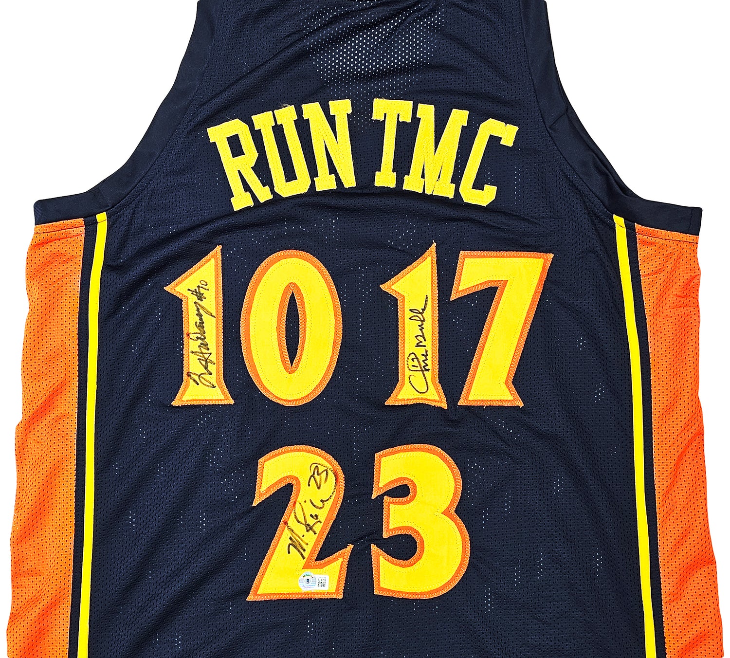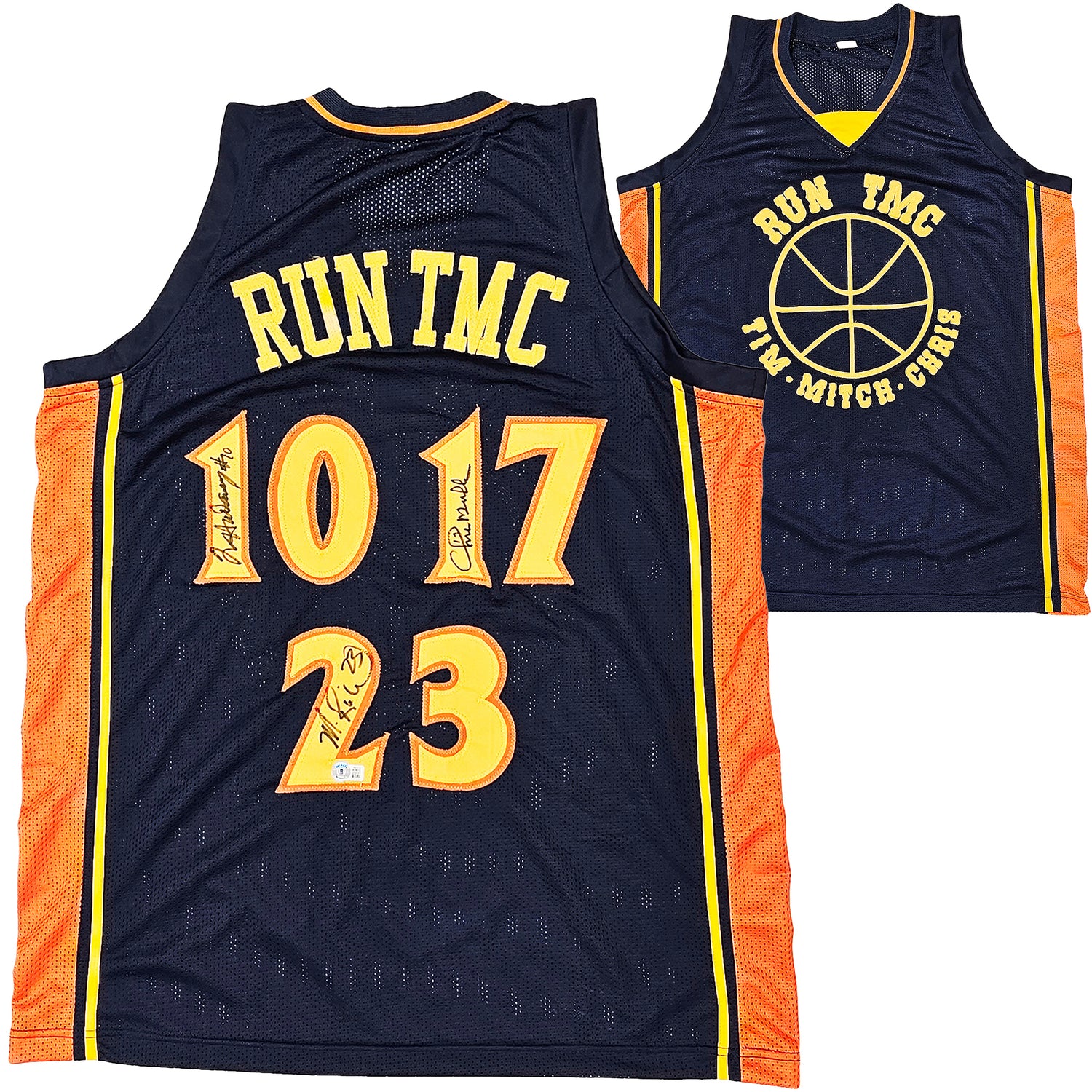 Golden State Warriors Chris Mullin, Tim Hardaway & Mitch Richmond Autographed Dark Blue Jersey Run TMC Beckett BAS Witness Stock #216821