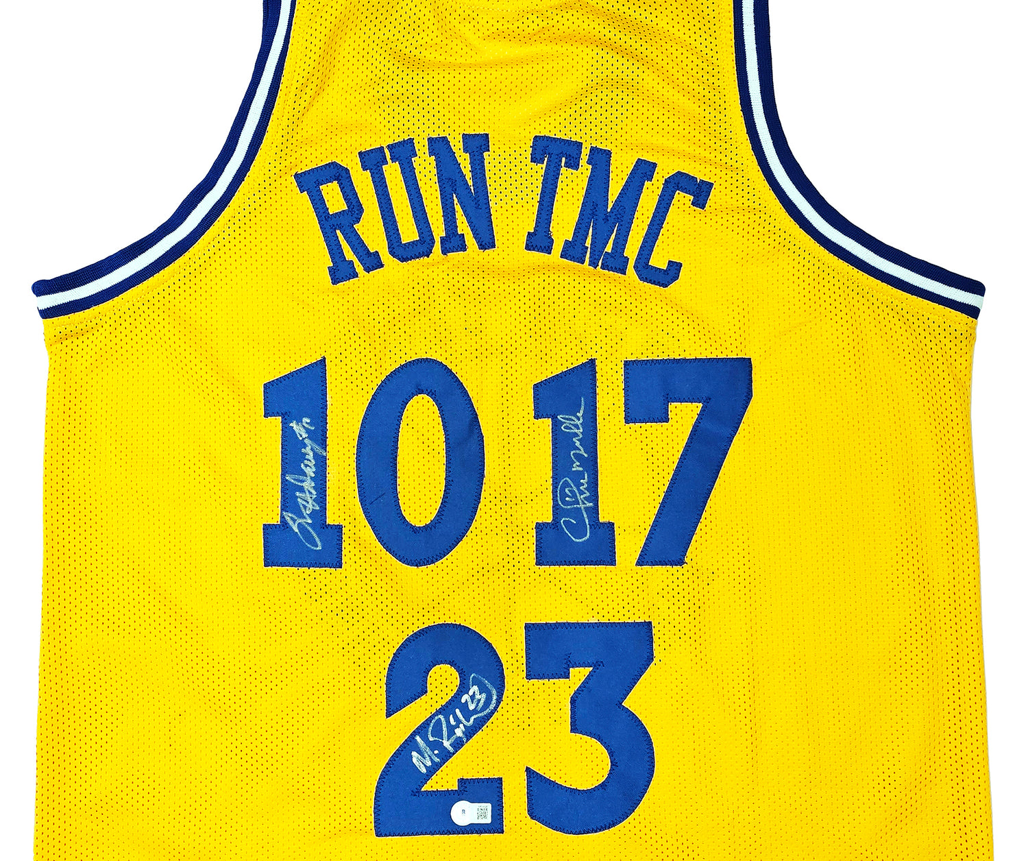 This Yellow Jersey has been hand-signed by the legendary trio Chris Mullin, Tim Hardaway, and Mitch Richmond, known as "Run TMC" from their time with the Golden State Warriors. This unique jersey is brand-free, approximately XL in size, and crafted with high-quality stitching for durability and display appeal.