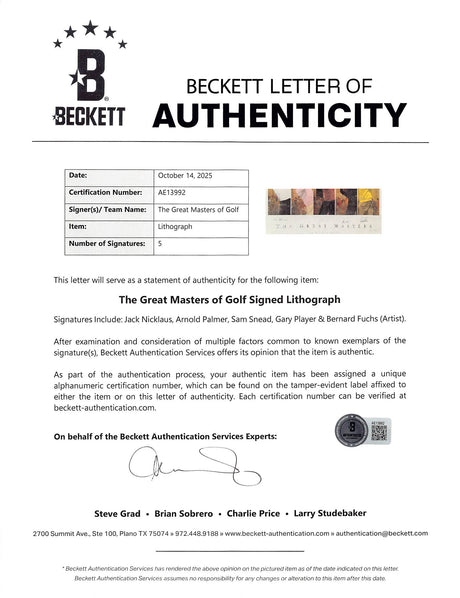 Golf Masters (5) Nicklaus, Palmer, Snead, Player Signed & Framed Lithograph BAS