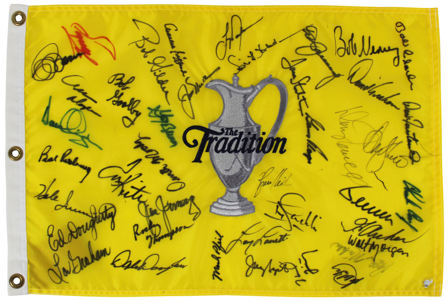 Own a true piece of golf history with this Autographed Traditions Pin Flag, personally signed by some of the greatest names in the sport. This rare collectible features signatures from legendary golfers, including Jack Nicklaus, Gary Player, Hale Irwin, Tom Kite, Fuzzy Zoeller, Tony Jacklin, Charlie Sifford, and many more. Whether you're a dedicated fan, historian, or collector, this flag is a must-have addition to your memorabilia collection.