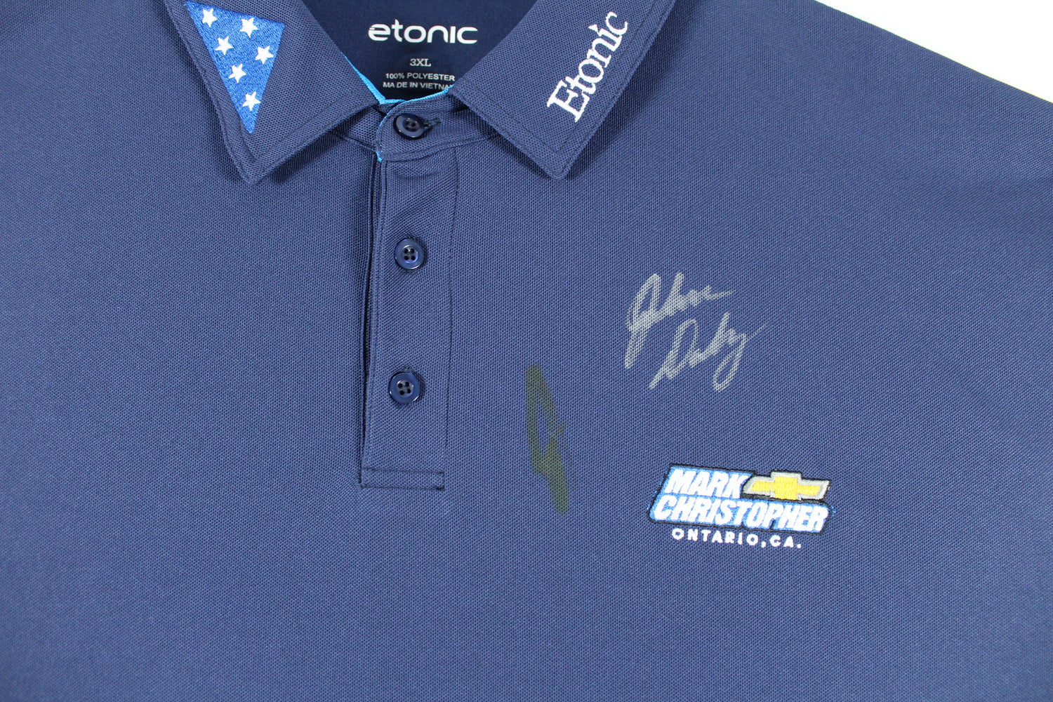 This Autographed Match-Worn Blue Folds of Honor Mark Christopher Chevy Etonic Polo Shirt is a rare and collectible piece of golf history, personally signed by John Daly. A true treasure for golf enthusiasts and memorabilia collectors, this shirt was worn by John Daly during competition and comes with a Letter of Authenticity from John Daly himself, confirming its match-worn status and origin from his personal collection.