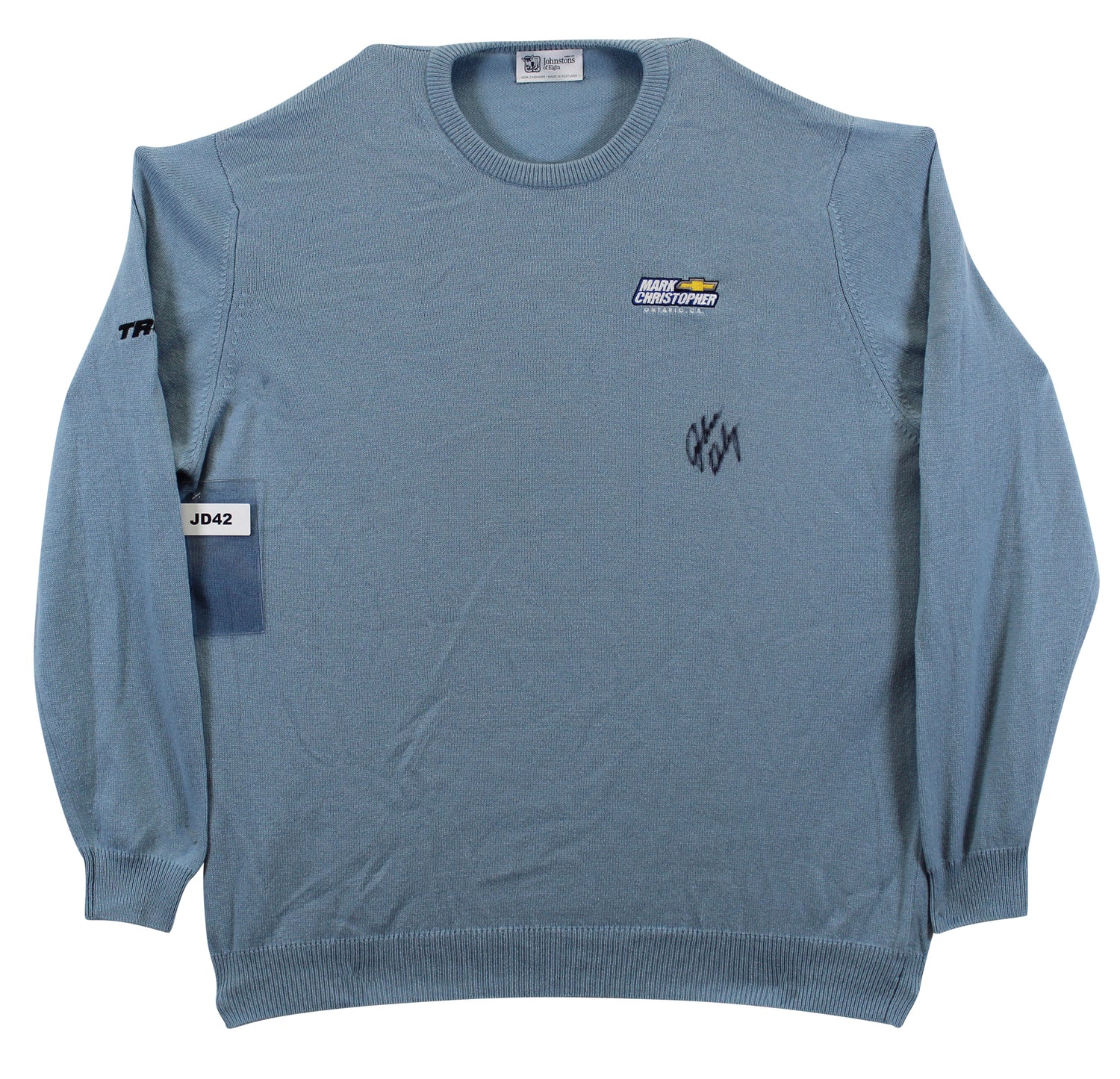 Own a remarkable piece of golf history with this Autographed Match-Worn Light Blue Johnstons of Elgin Cashmere Sweater, personally signed by legendary golfer John Daly. This premium cashmere sweater, featuring Mark Christopher Chevy Rock Bottom Golf Trump branding, is an exclusive collector’s item, offering both authenticity and provenance directly from John Daly’s personal collection.