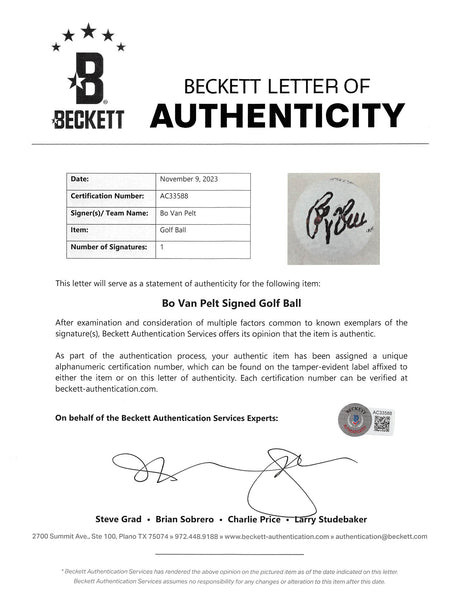 Very low stock (1 unit)$99Unit price /UnavailableBo Van Pelt Signed Waste Management Open Logo Bridgestone Golf Ball BAS #AC33592