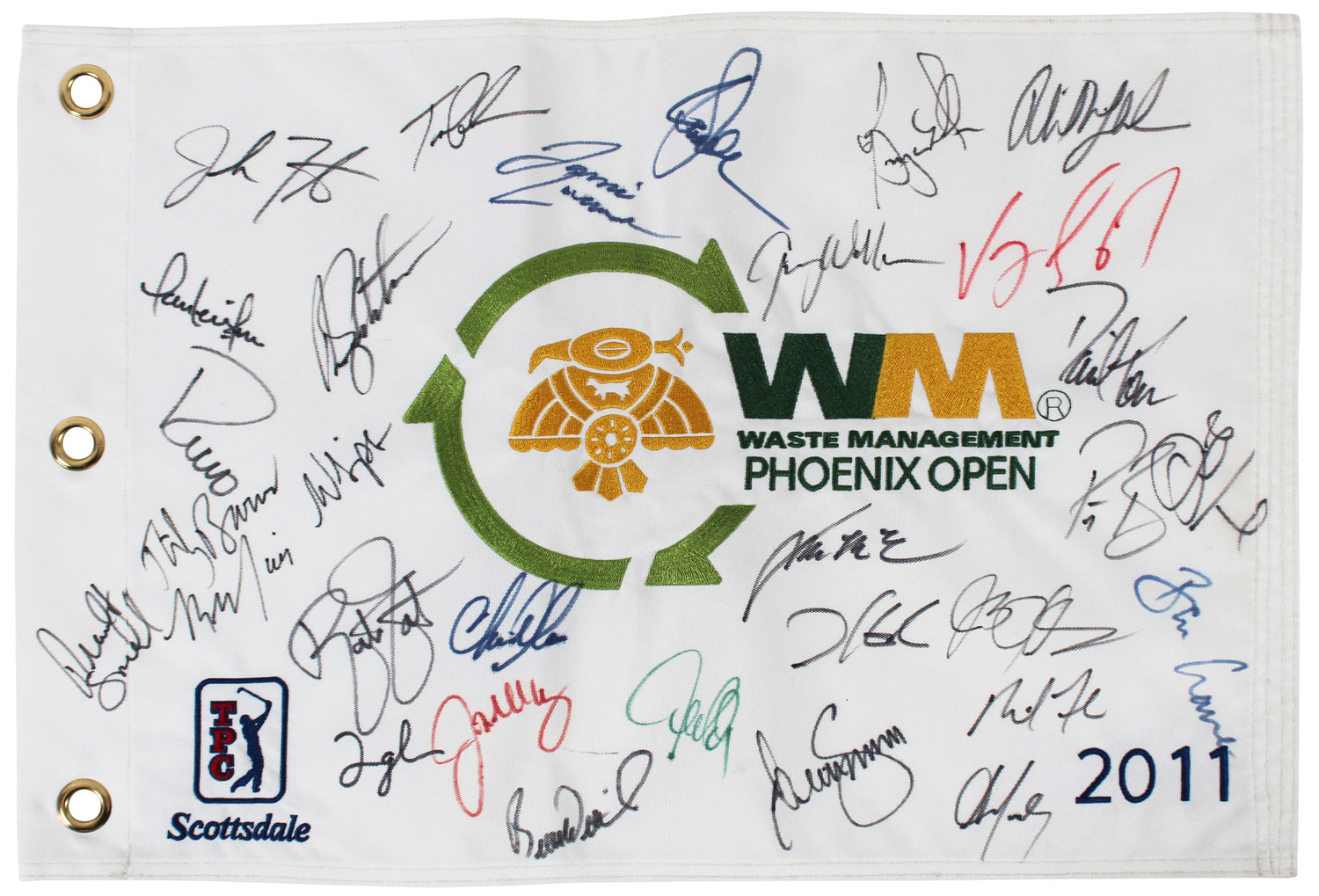 Own a unique piece of golf history with this Autographed 2011 Waste Management Open Logo Pin Flag, personally signed by some of the biggest names in the sport. A must-have for collectors, this memorabilia captures the excitement of one of the PGA Tour's most thrilling events.