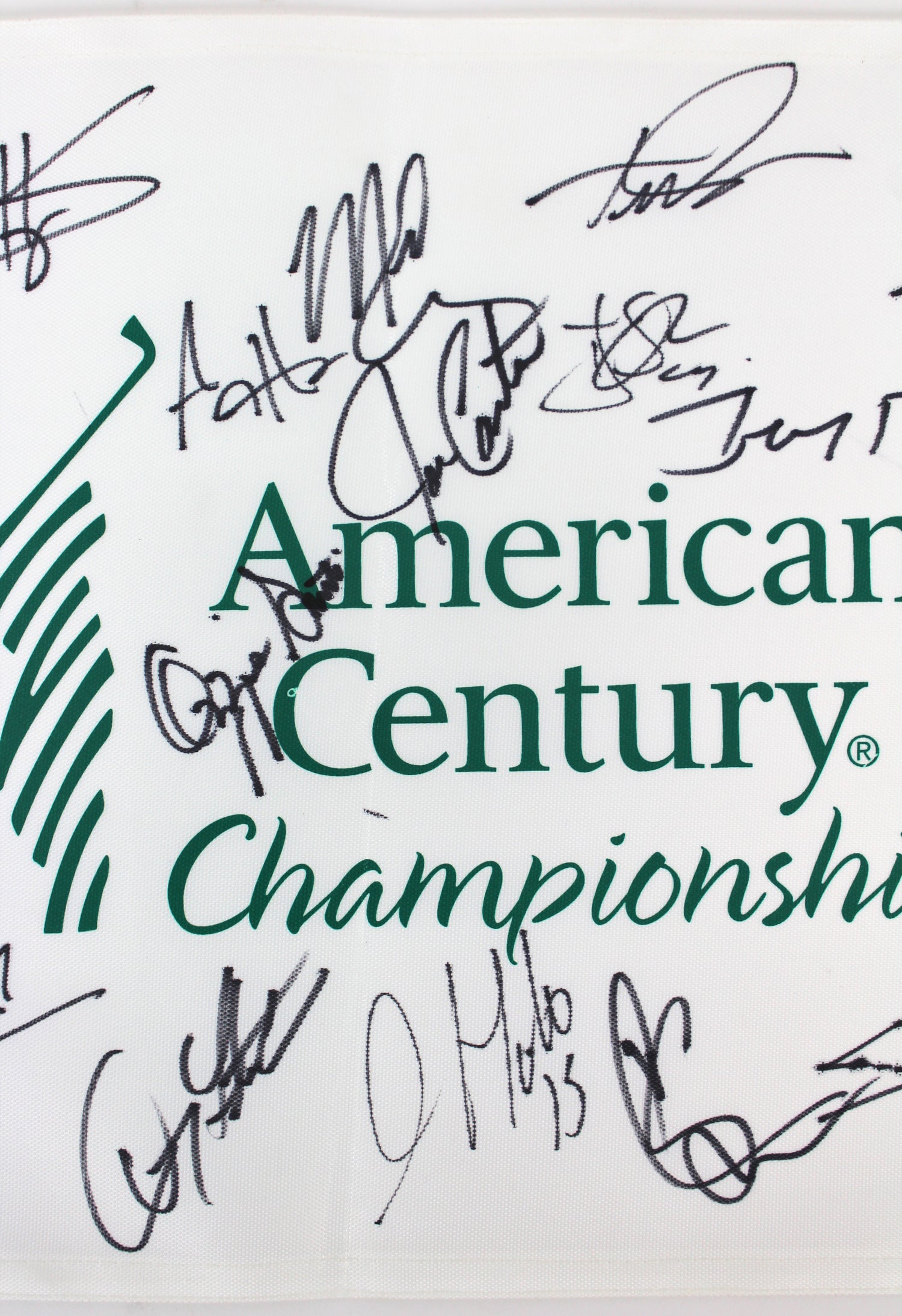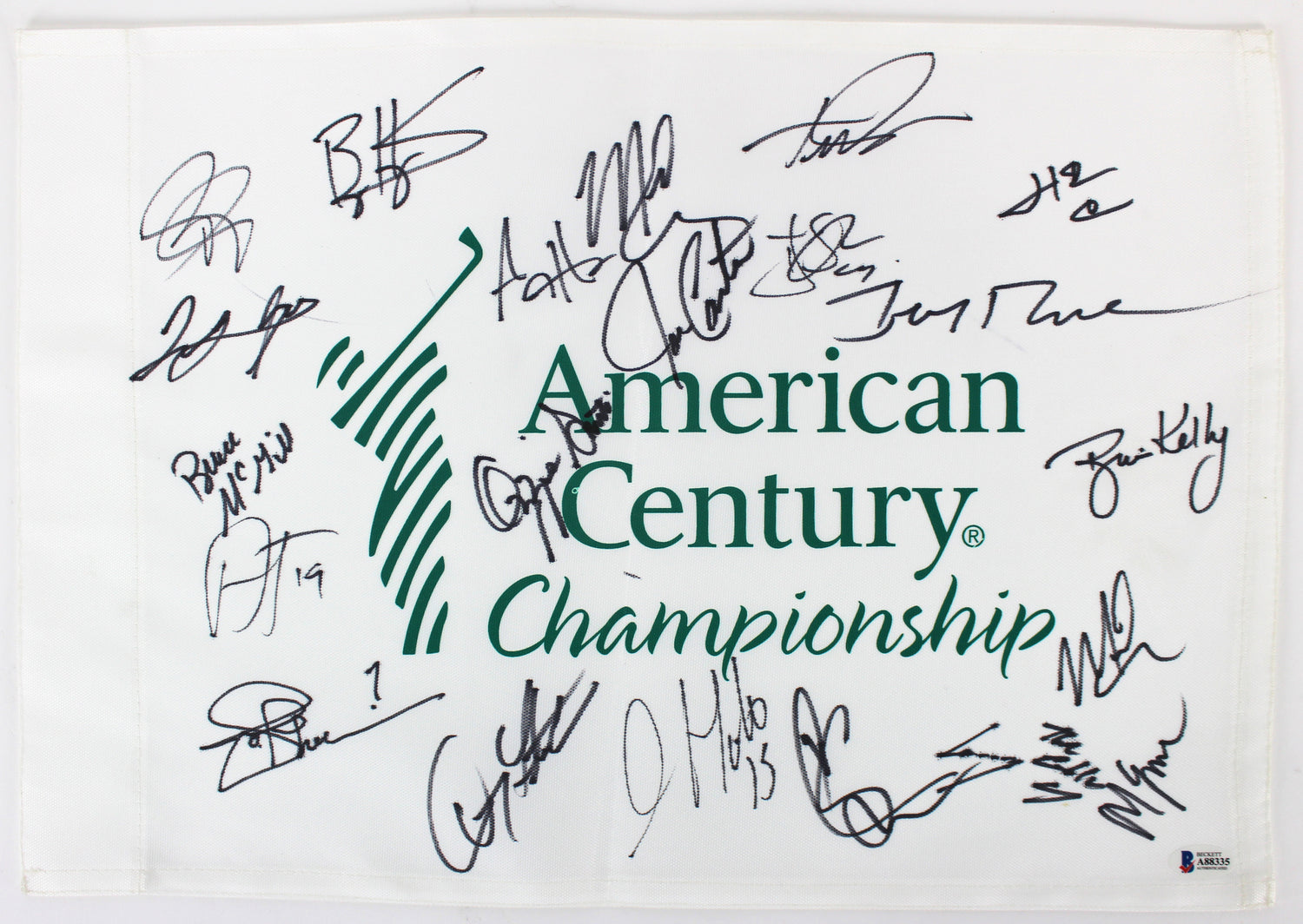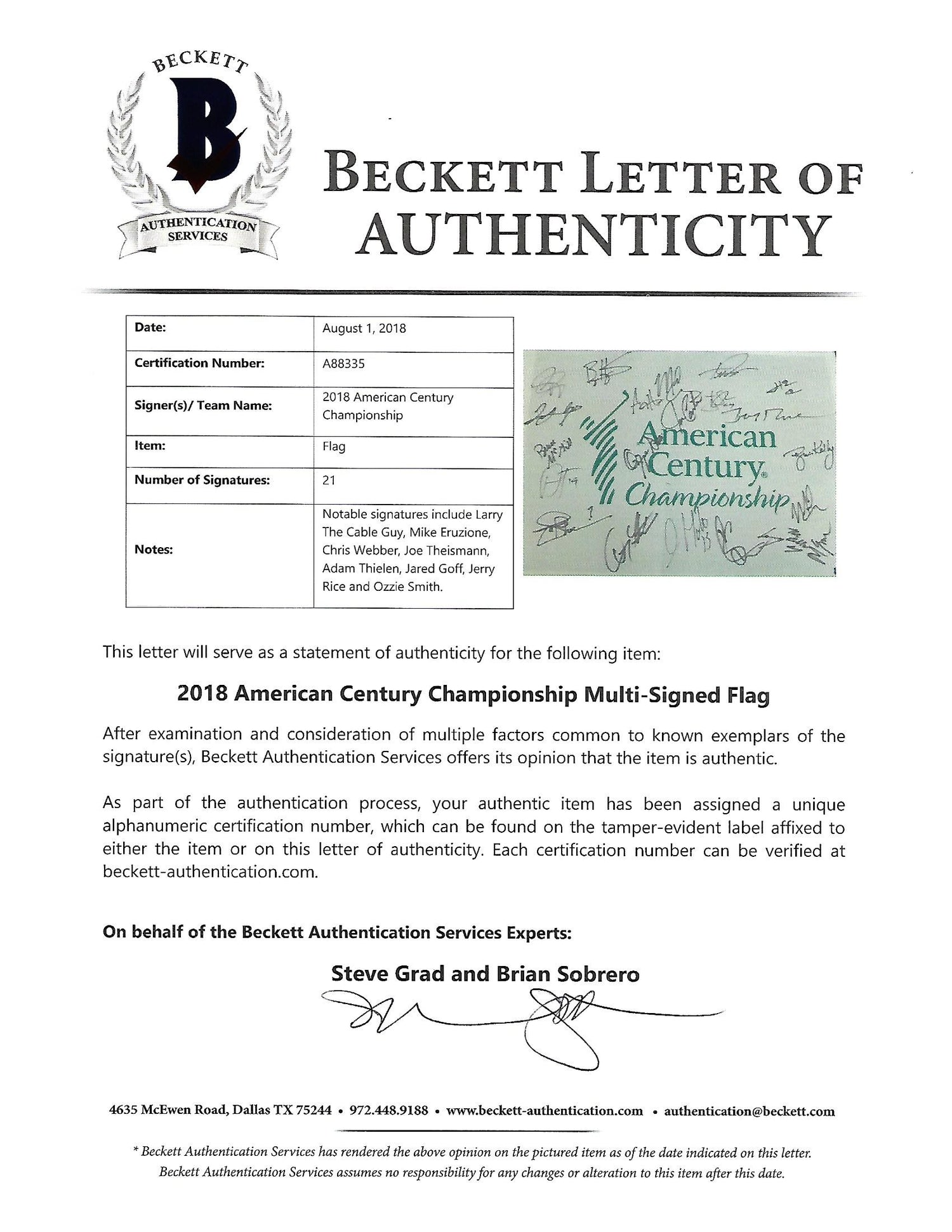 Own a piece of sports and pop culture history with this Autographed American Century Championship Pin Flag, personally signed by an incredible lineup of athletes and celebrities. This highly collectible flag features authentic signatures from Brian Kelly, Miles Teller (x2), Larry The Cable Guy, Mike Eruzione, Chris Webber, Golden Tate, Doug Flutie, Joe Theismann, Adam Thielen, Bruce McGill, Jared Goff, Patrick Peterson, Ben Higgins, A.J. Hawk, Joe Carter, T.J. Oshie, Jerry Rice, Ozzie Smith, and Herm Edwards. This one-of-a-kind item is 100% authentic and includes a Certificate of Authenticity (COA) and a Beckett Authentication Services hologram. You can verify the authenticity directly through Beckett Authentication Services' website. ### Why This Collectible Is a Must-Have: