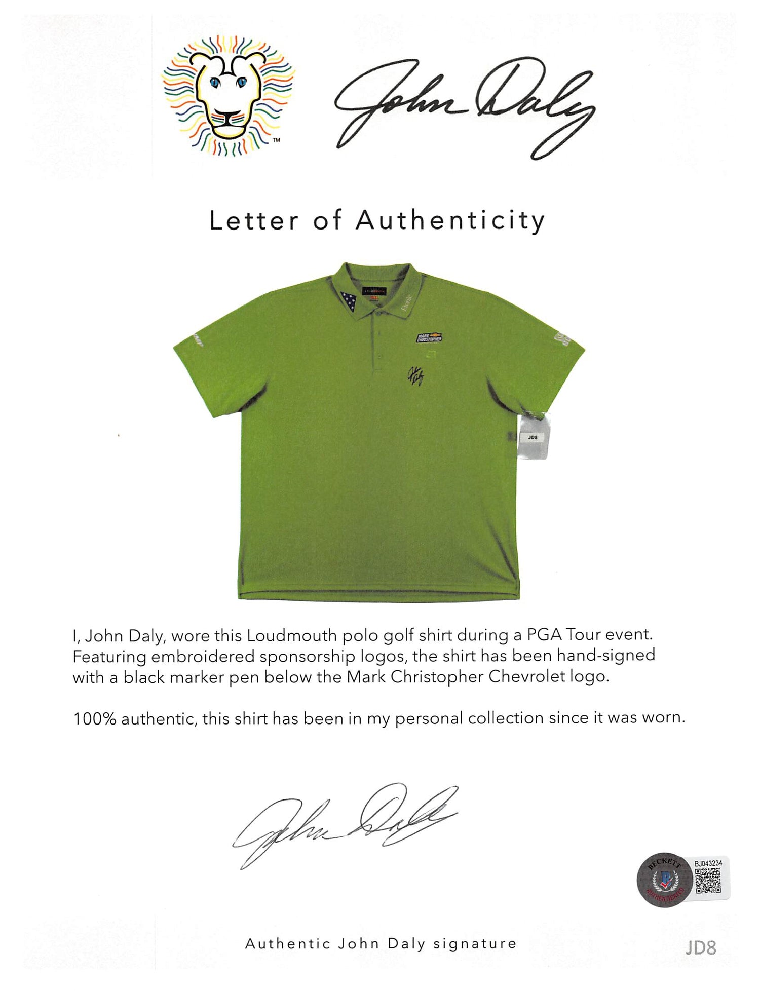 This Autographed Match-Worn Green Folds of Honor Mark Christopher Chevy Loudmouth Polo Shirt is a rare collector's item personally signed by golf legend John Daly. A true piece of golf history, this XXX-Large match-worn polo was worn by Daly himself and comes directly from his personal collection.