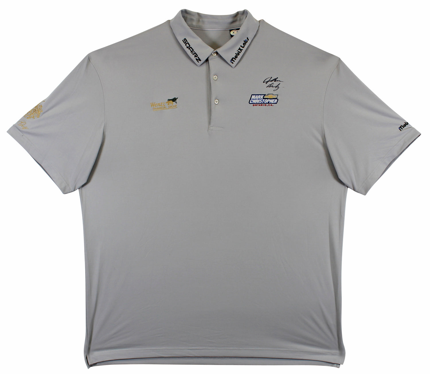 Own a true piece of golf history with this Match Worn Grey Mark Christopher Wentz Financial SQAIRZ Mobix Labs Trump Golf Polo Shirt, personally signed by legendary golfer John Daly. This exclusive item was match-worn by Daly himself and comes directly from his personal collection, making it a must-have for serious collectors and golf enthusiasts.