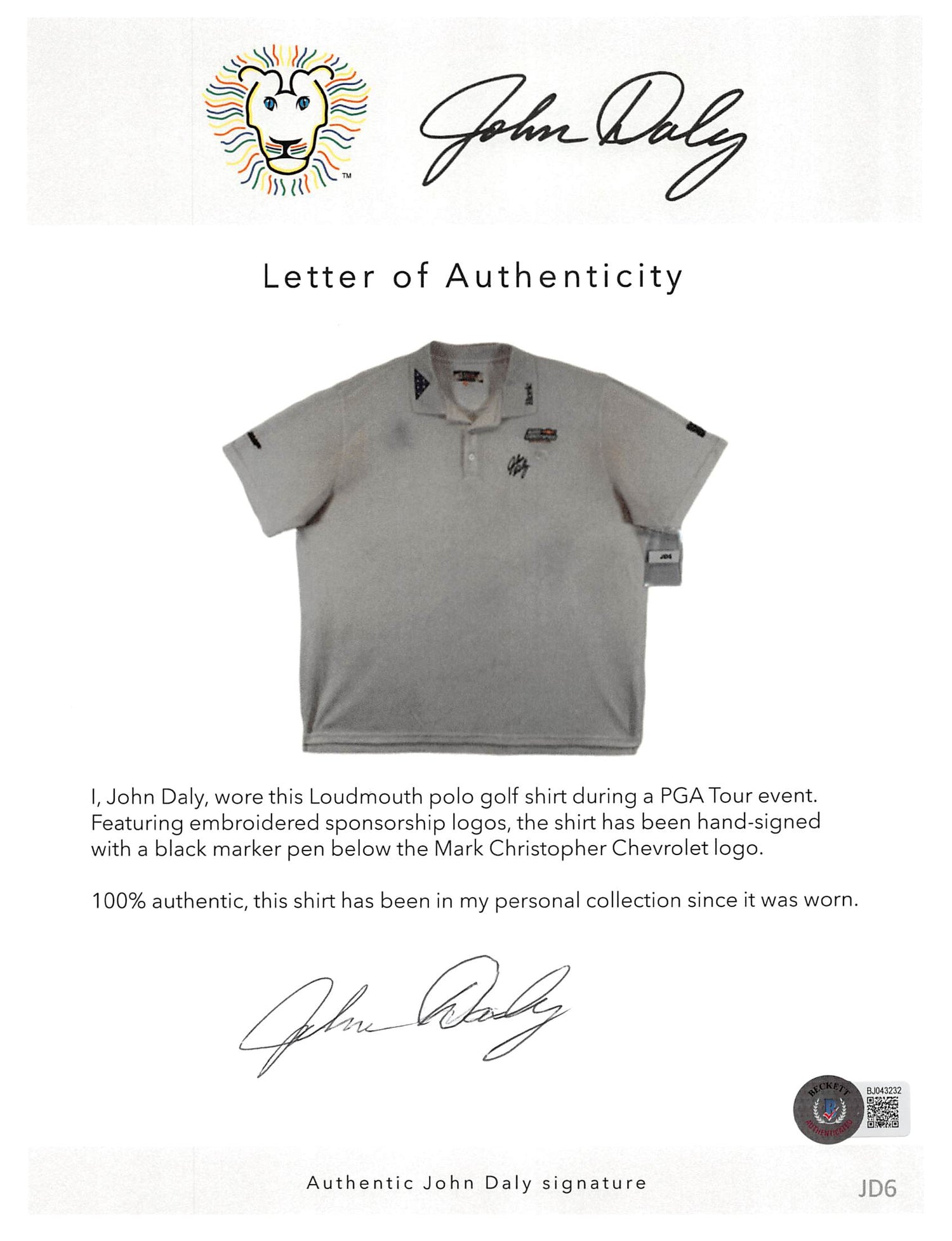 - Match-Worn & Signed: This polo shirt was worn by legendary golfer John Daly and is personally autographed.