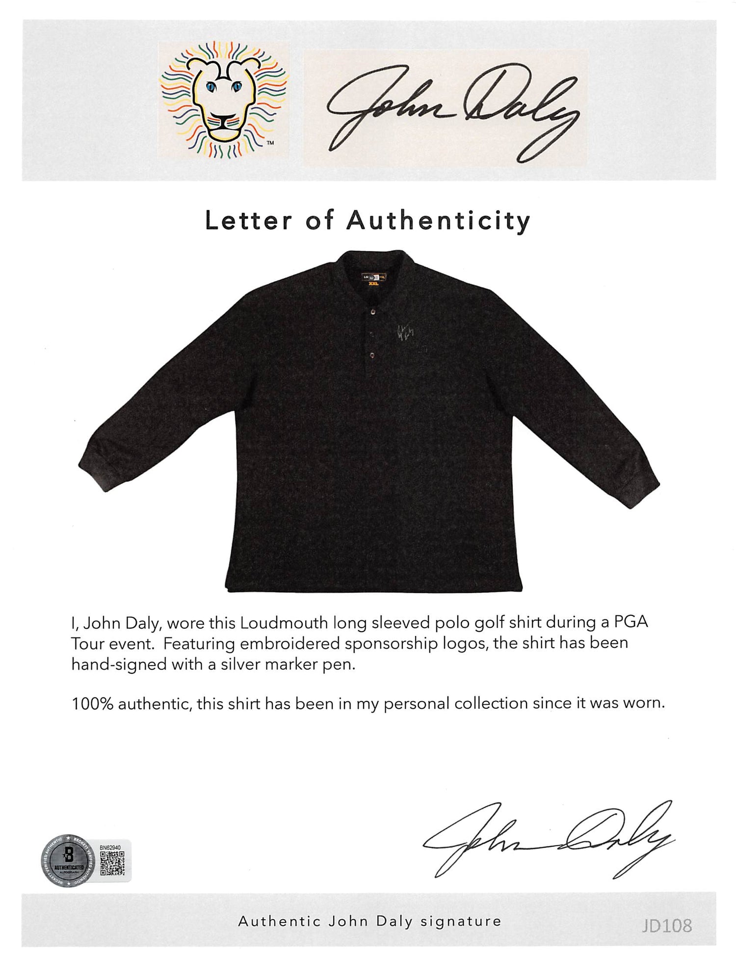 - Match Worn & Certified – Comes with a Letter of Authenticity from John Daly, verifying its provenance and confirming that he wore this shirt during play.