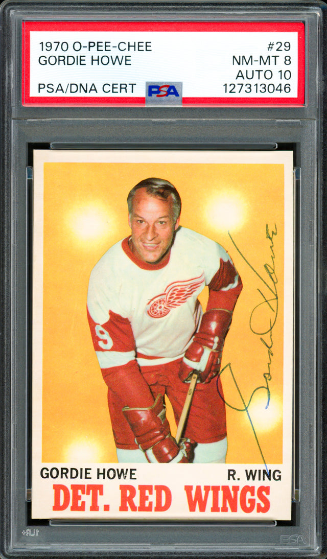 Collector-Grade autographed memorabilia: signed Gordie Howe 1970 O-Pee-Chee #29 (Detroit Red Wings), PSA 8 with PSA/DNA Gem Mint 10 autograph Howe, known as “Mr. Hockey,” captured four Stanley Cups with Detroit, won six Hart Trophies and six Art Ross titles, and entered the Hockey Hall of Fame in 1972. He finished with 801 NHL goals and 23 All-Star selections across an unparalleled five-decade career.