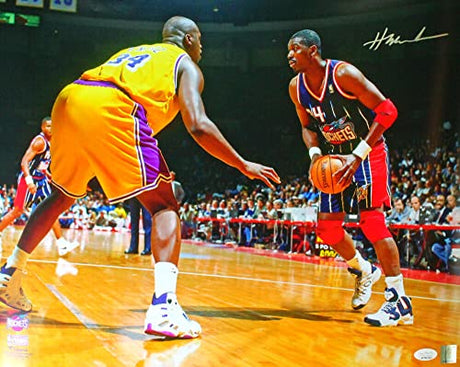 Hakeem Olajuwon Houston Rockets Autographed 16x20 Vs. Shaq Photo- JSA W *Silver