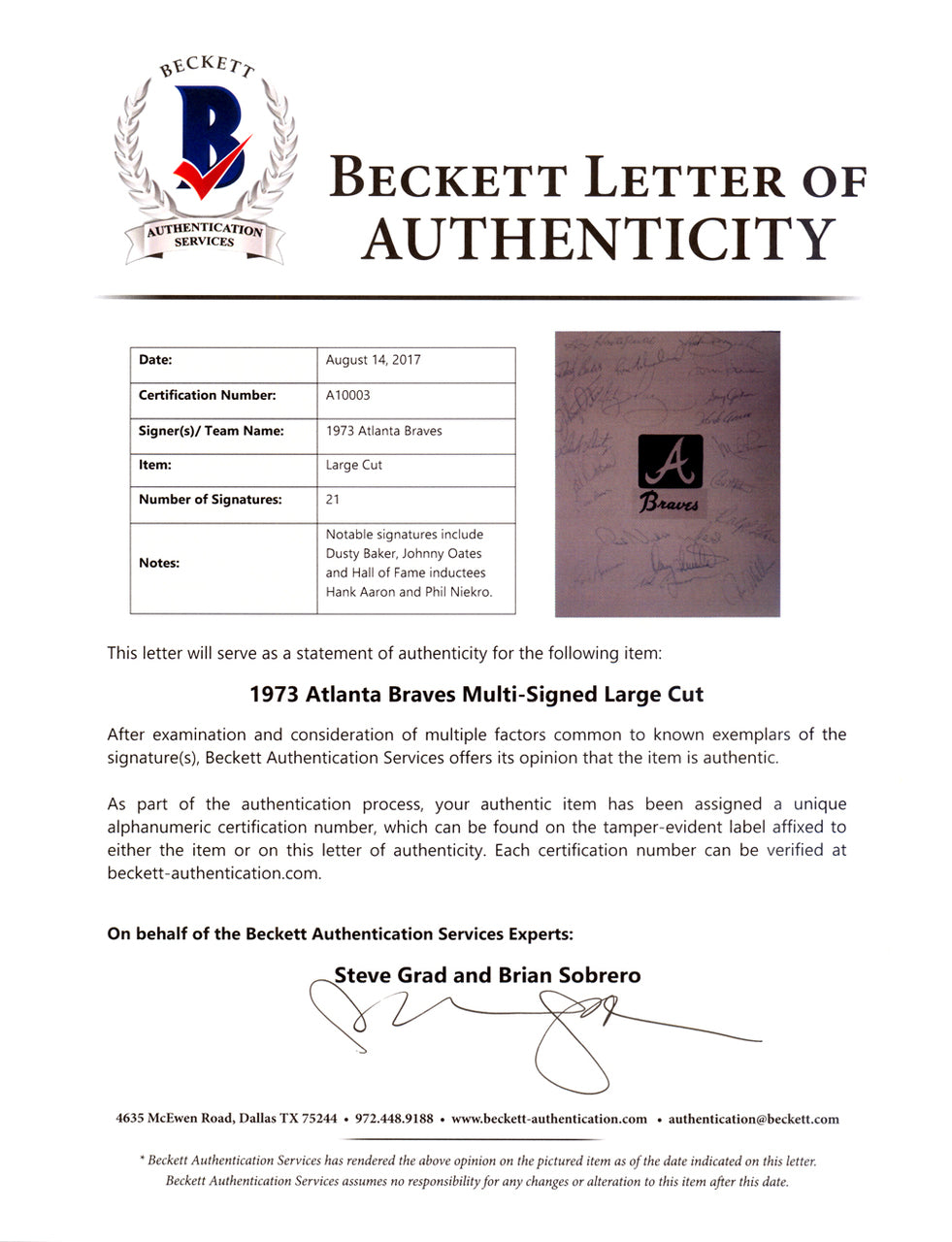 - Other notable autographs: Dusty Baker, Johnny Oates, Phil Niekro, Roric Harrison, Ron Schueler, Sonny Jackson, Carl Morton, Ron Reed, Ralph Garr, Mike Lum, Tom House, Pat Dobson, Oscar Brown, Dick Dietz, Marty Perez, and Paul Casanova