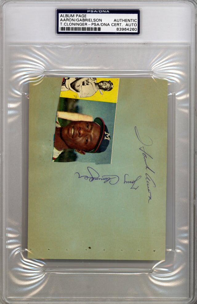 This vintage 1960s hand-signed 4.5x6 album page is a rare collector's piece, featuring the autograph of Hall of Famer Hank Aaron along with signatures from Tony Cloninger and Len Gabrielson. This early-career Hank Aaron autograph adds incredible historical value for baseball enthusiasts and memorabilia collectors alike. Authenticated by PSA/DNA, this item comes encapsulated in their tamper-proof holder for permanent preservation.