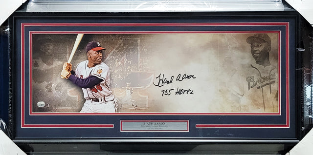 Hank Aaron Autographed Framed 10x30 Panoramic Photo Milwaukee Braves "755 HOF 82" Fanatics Holo #1087385 is backordered and will ship as soon as it is back in stock.