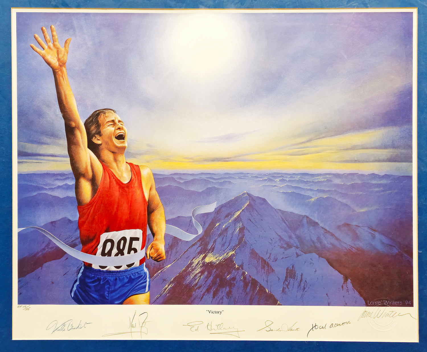 Own a piece of history with this Framed 17x21 Victory Lithograph Photo, beautifully displayed in an approximately 25x28 frame. This rare collector's item has been hand-signed by legendary figures across sports, space exploration, and journalism, including Neil Armstrong, Hank Aaron, Gordie Howe, Walter Cronkite, Ed Hillary, and Lorne Winters.