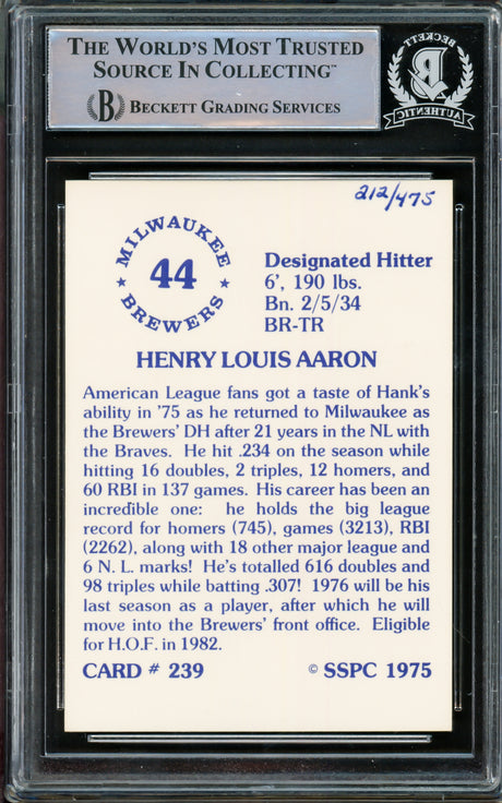 Hank Aaron Autographed 1975 SSPC Card #239 Milwaukee Brewers Beckett BAS #14612284