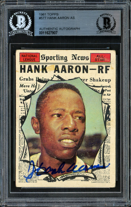 Hank Aaron Autographed 1961 Topps Card #577 Milwaukee Braves Beckett BAS #11627907