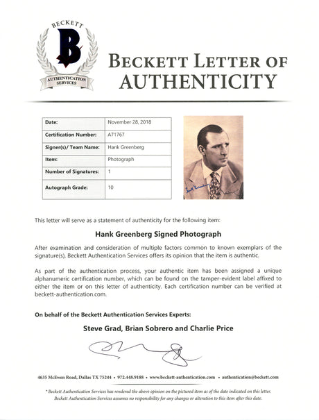 Hank Greenberg Autographed 8x10 Photo Detroit Tigers Auto Grade Gem Mint 10 Beckett BAS #18630338