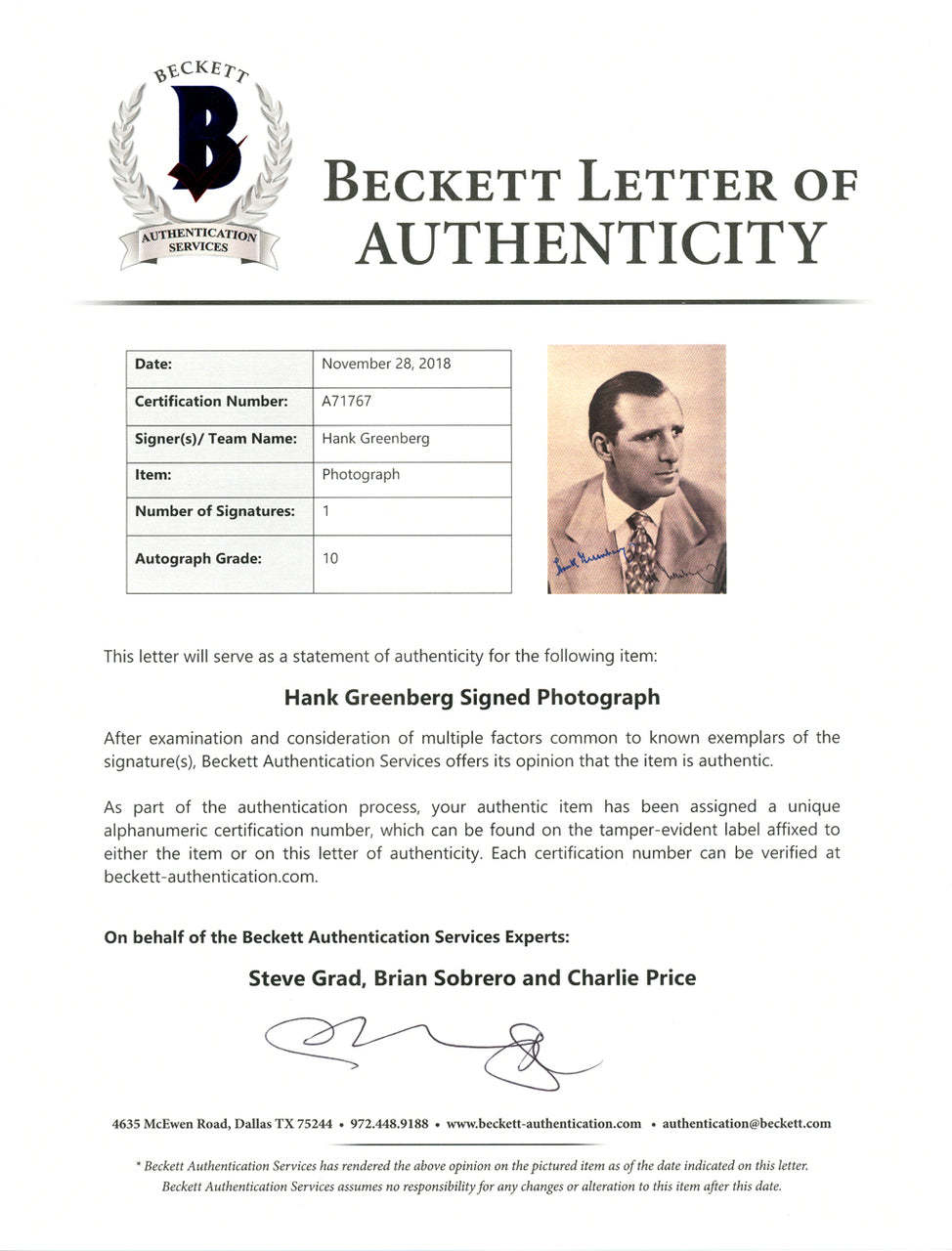 Hank Greenberg Autographed 6.5x9 Photo Picture Pack 1948 Cleveland Indians Gem Mint 10 Beckett BAS #A71767