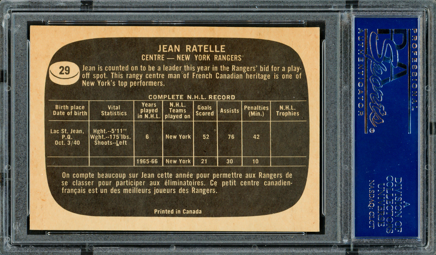 Add a legendary piece to your hockey memorabilia collection with this 1966 Topps Card #29, hand signed by Hall of Famer Jean Ratelle. A standout center for the New York Rangers, Ratelle’s smooth playmaking and consistent scoring made him one of the NHL’s most respected stars during the Original Six era. This card not only captures a pivotal moment early in Ratelle’s prestigious career, but also showcases a beautifully preserved autograph, authenticated and encapsulated by PSA/DNA for lifetime security and confidence. Whether you’re a dedicated Rangers fan, vintage hockey enthusiast, or serious card collector, this is a must-have addition to your collection.