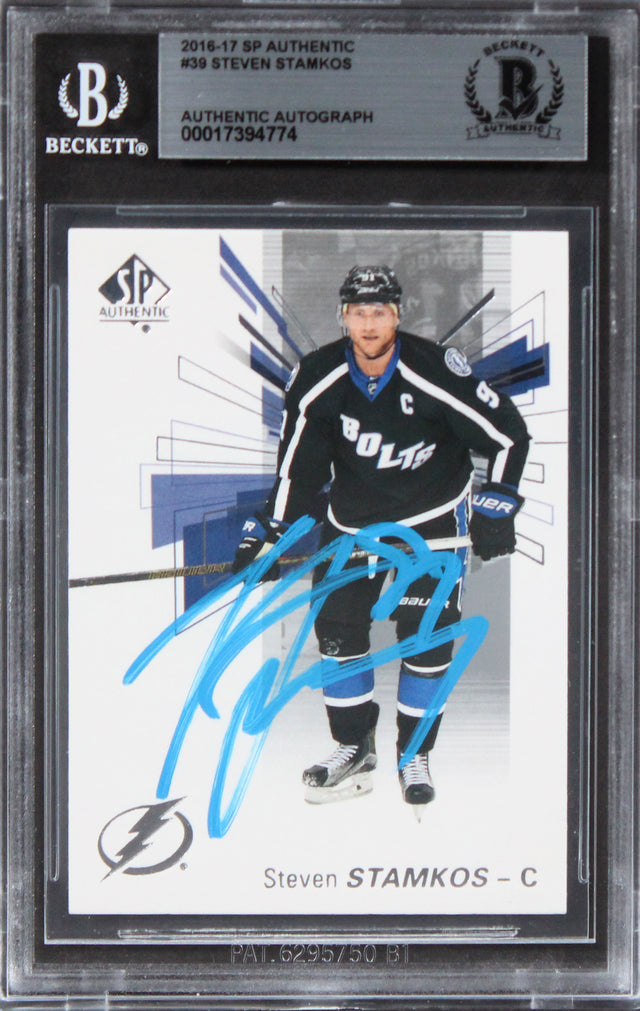 Own a piece of hockey history with this Autographed 2016 SP Authentic #39 Card, personally signed by Steven Stamkos of the Tampa Bay Lightning. A must-have for serious collectors and Lightning fans, this rare signed card celebrates one of the NHL's most elite goal scorers. Authenticated and slabbed by Beckett Authentication Services (BAS), ensuring 100% genuine authenticity. You can verify its legitimacy directly on the Beckett Authentication Services website.