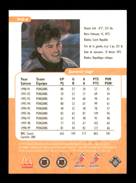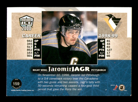 Very low stock (1 unit)$59Unit price /UnavailableJaromir Jagr Autographed 1999-00 Pacific Dynagon Ice Card #159 Pittsburgh Penguins SKU #248126