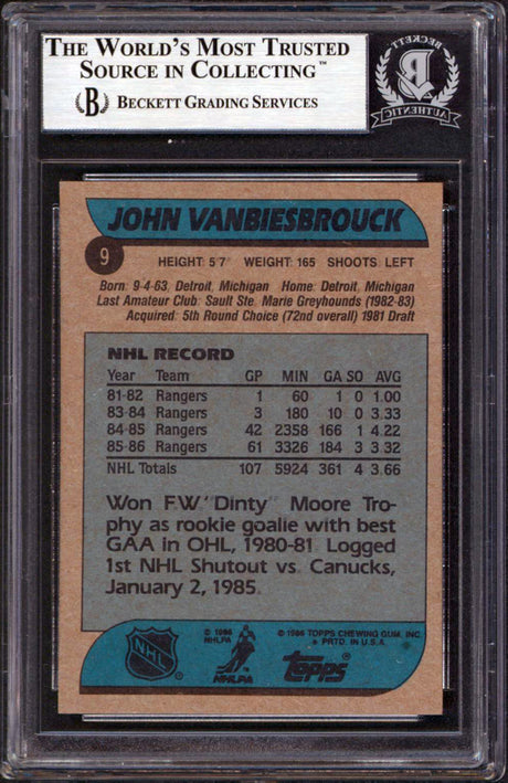 Very low stock (1 unit)$129Unit price /Unavailable Rangers John Vanbiesbrouck Authentic Signed 1986 Topps #9 Card BAS Slabbed