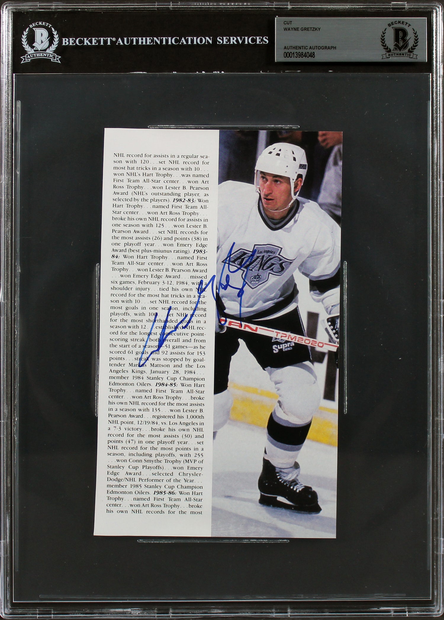 Own a piece of hockey history with this Wayne Gretzky Autographed 4.75x8 Magazine Page, signed by the legendary Los Angeles Kings icon himself. This rare collectible is a must-have for serious fans and memorabilia enthusiasts. Authenticated and slabbed by Beckett Authentication Services, ensuring its 100% authenticity.