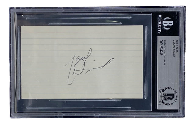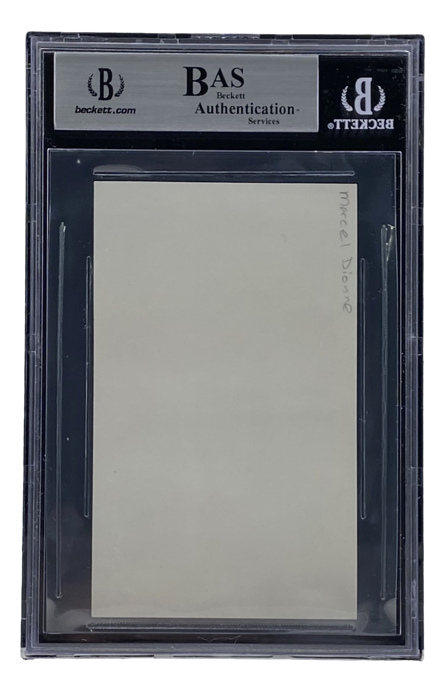 Add a piece of hockey history to your collection with this Marcel Dionne Quebec Nordiques signed index card, a rare treasure for any serious fan or sports memorabilia enthusiast. Hand-signed by Hockey Hall of Famer Marcel Dionne, one of the greatest scorers in NHL history, this item celebrates his late-career time with the historic Quebec Nordiques franchise. The signature is securely slabbed and authenticated by Beckett, ensuring both its authenticity and long-term preservation.